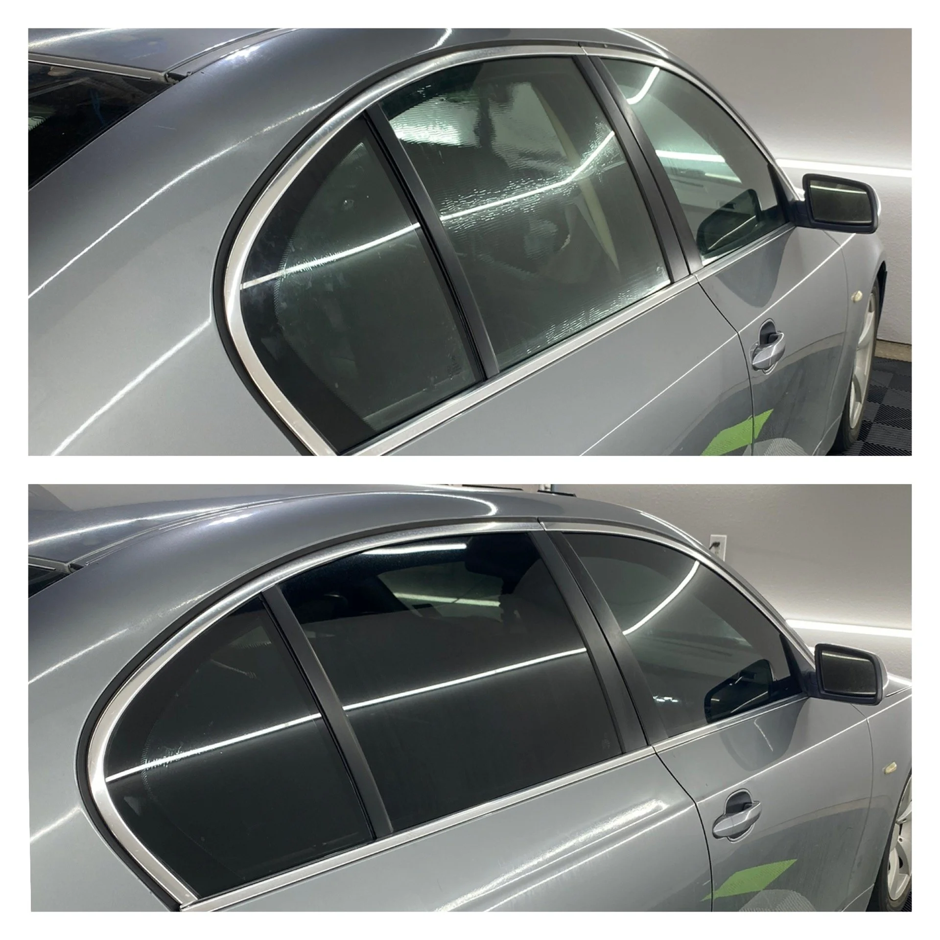 Comparison of a car's rear side window, showing a tinted window in the lower image and a clear window in the upper image.