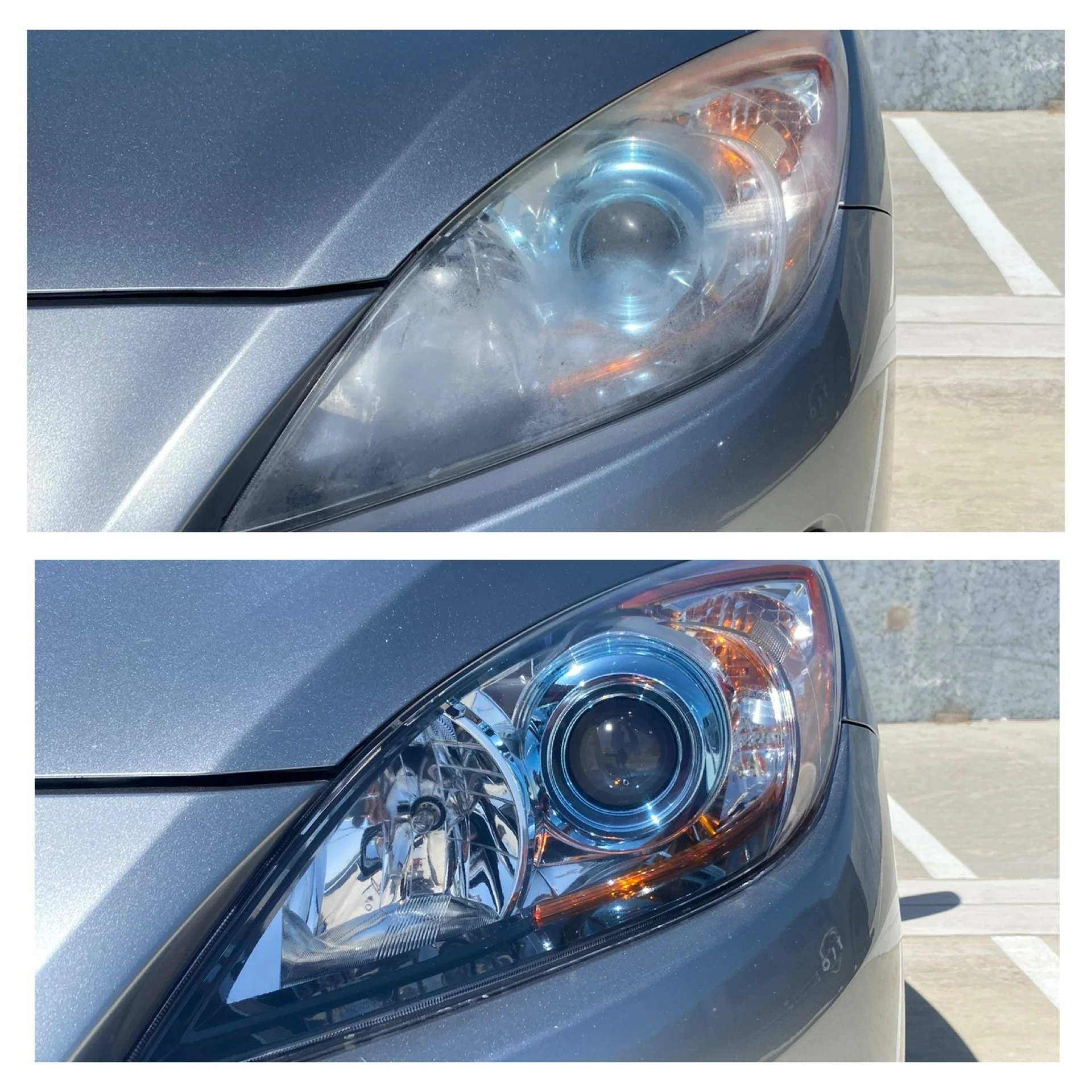 Comparison of a car's headlight before and after cleaning or restoration, showing a cloudy, foggy headlight in the top image and a clear, shiny headlight in the bottom image.